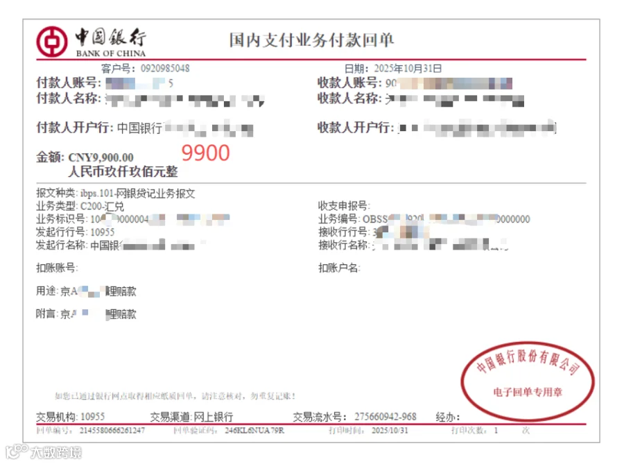 补偿金额:玖仟玖佰元整(小写:9900元)