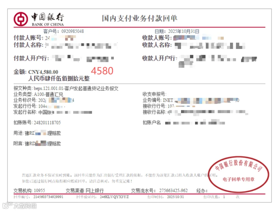 补偿金额:肆仟伍佰捌拾元整(小写:4580元)