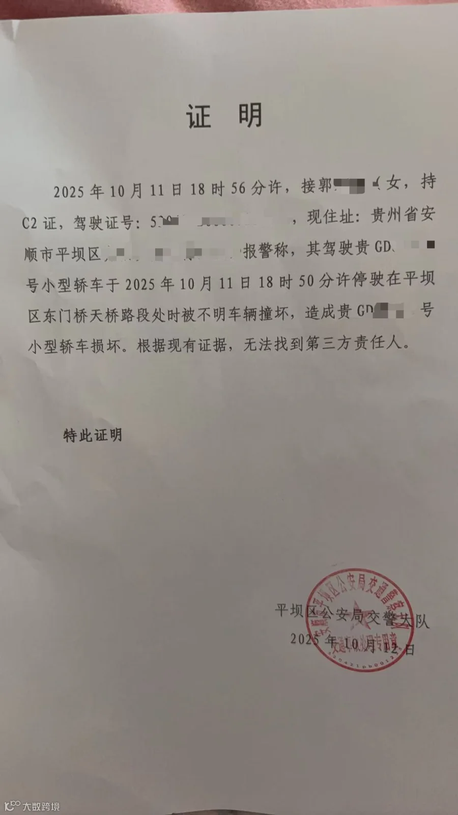 ***小型汽车于2025年10月11日18时50分许 停驶在平坝区东门桥天路段处时被不明车辆撞坏,造成贵GD****号小型轿车损坏。根据现有证据,无法找到第三方责任人。