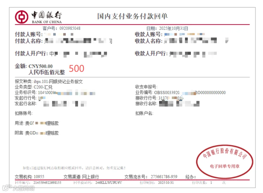 此次服务支出补偿款500元。事故发生后,我司查勘人员提供专业服务,指导车主按流程处理,快速定损并及时打款,完美解决车主之所急,体现出亲情及关怀式补偿措施。