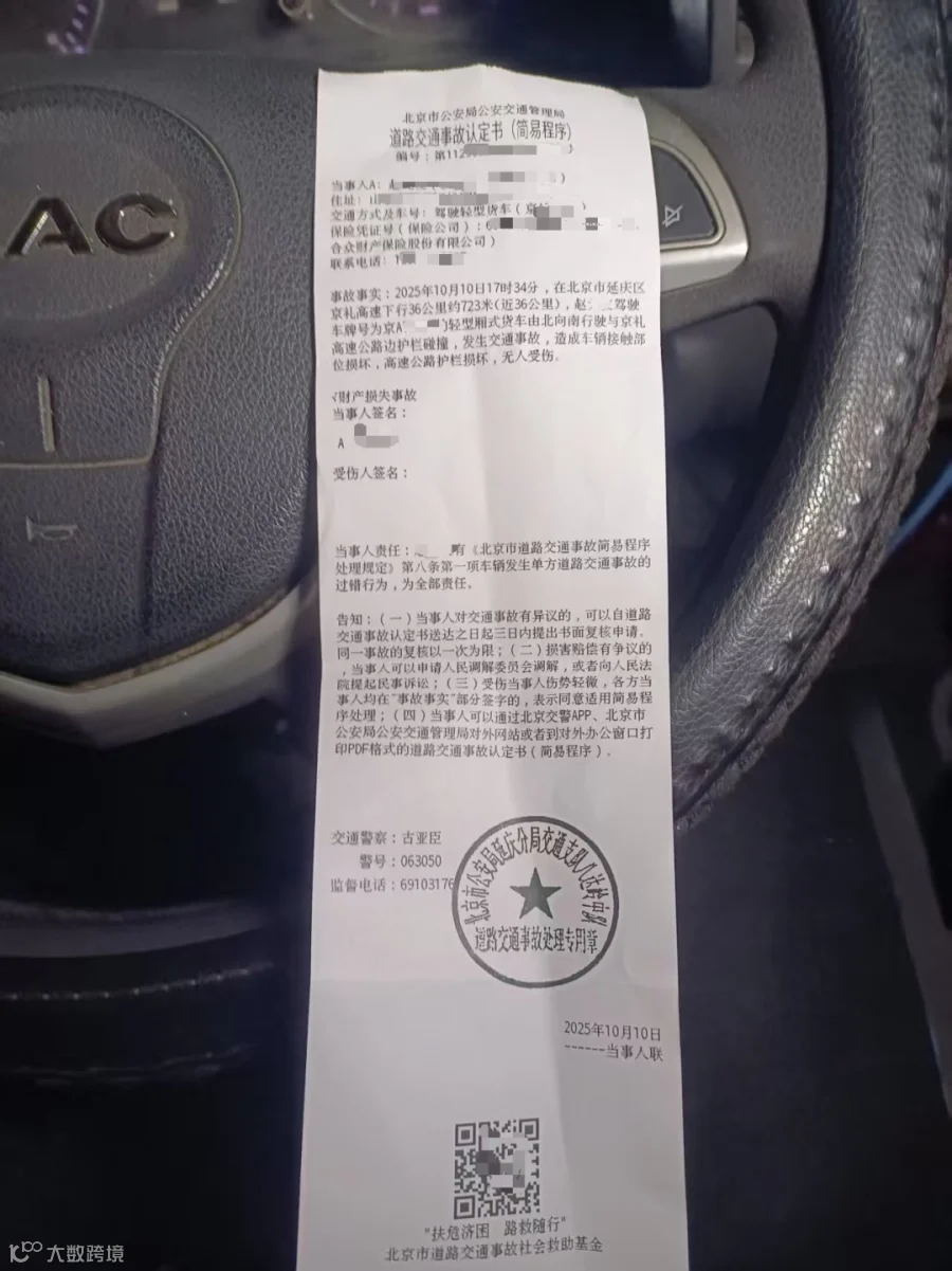 事故经过::2025年10月10日17时34分,在北京市延庆区京礼高速下行36公里约723米(近36公里),赵**驾驶车牌号为京A****的轻型厢式货车由北向南行驶与京礼高速公路边护栏碰撞,发生交通事故,造成车辆接触部位损坏,高速公路护栏损坏,无人受伤。