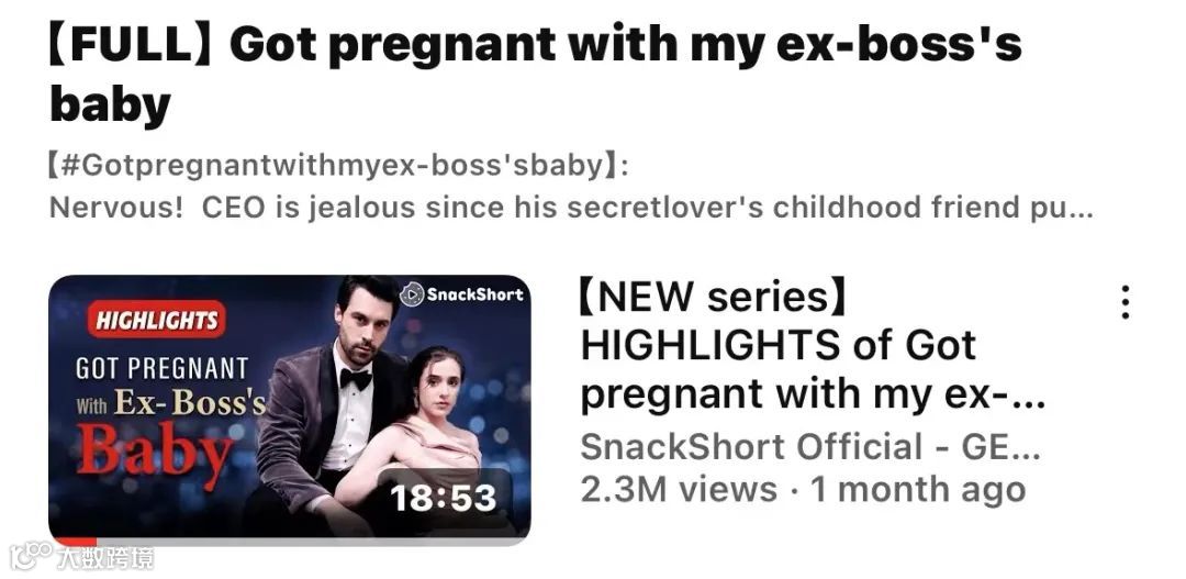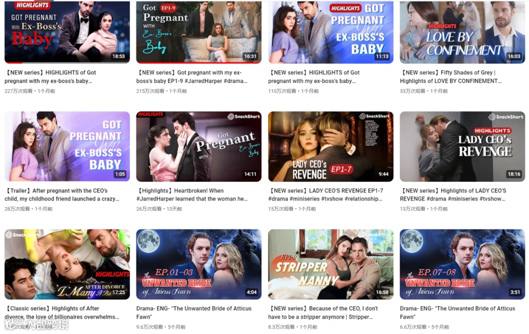 “你的朋友知道你是我爱人吗?”“我能向他们展示一下你在我床上的样子吗?”“你喜欢孩子吗?”“我们结束了。”长达18分钟的highlight(亮点)剪辑中,集结了数次暧昧香艳的亲吻&强取豪夺,还有女主被分手后得知怀孕的小心斡旋、霸总男主的“他追,她逃,她插翅难飞”,整部短剧最精华的部分一股脑倾泻而出,让所有观众欲罢不能。这部短剧作品名为《Got Pregnant with my ex boss’s baby》,在YouTube,其单条剪辑视频几乎均获得200万+播放量,颇有横扫之势。