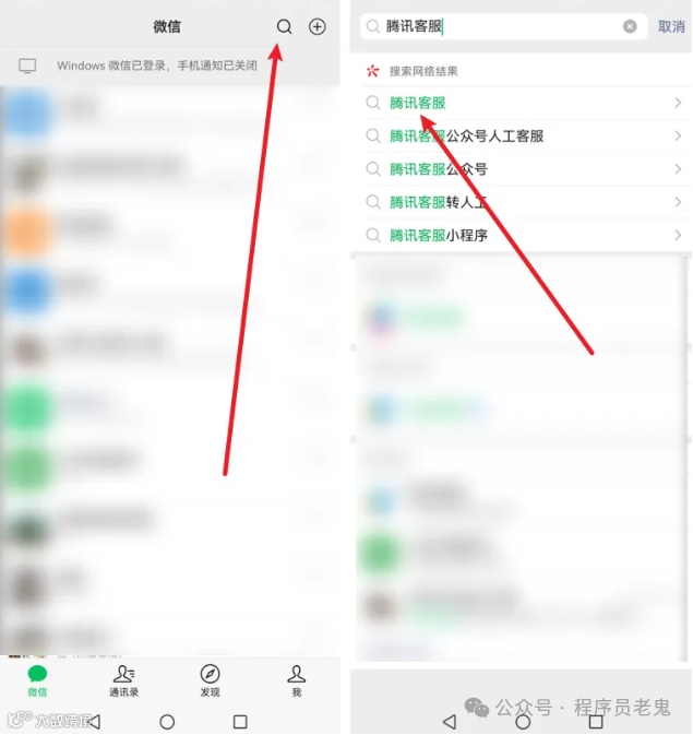 输入“腾讯客服”,选择并关注【腾讯客服】公众号。 -