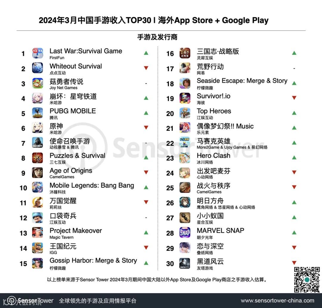 【《Last War:Survival Game》问鼎3月出海手游收入榜】近日,Sensor Tower商店情报平台公布了2024年3月中国手游产品在海外市场收入排行榜。
