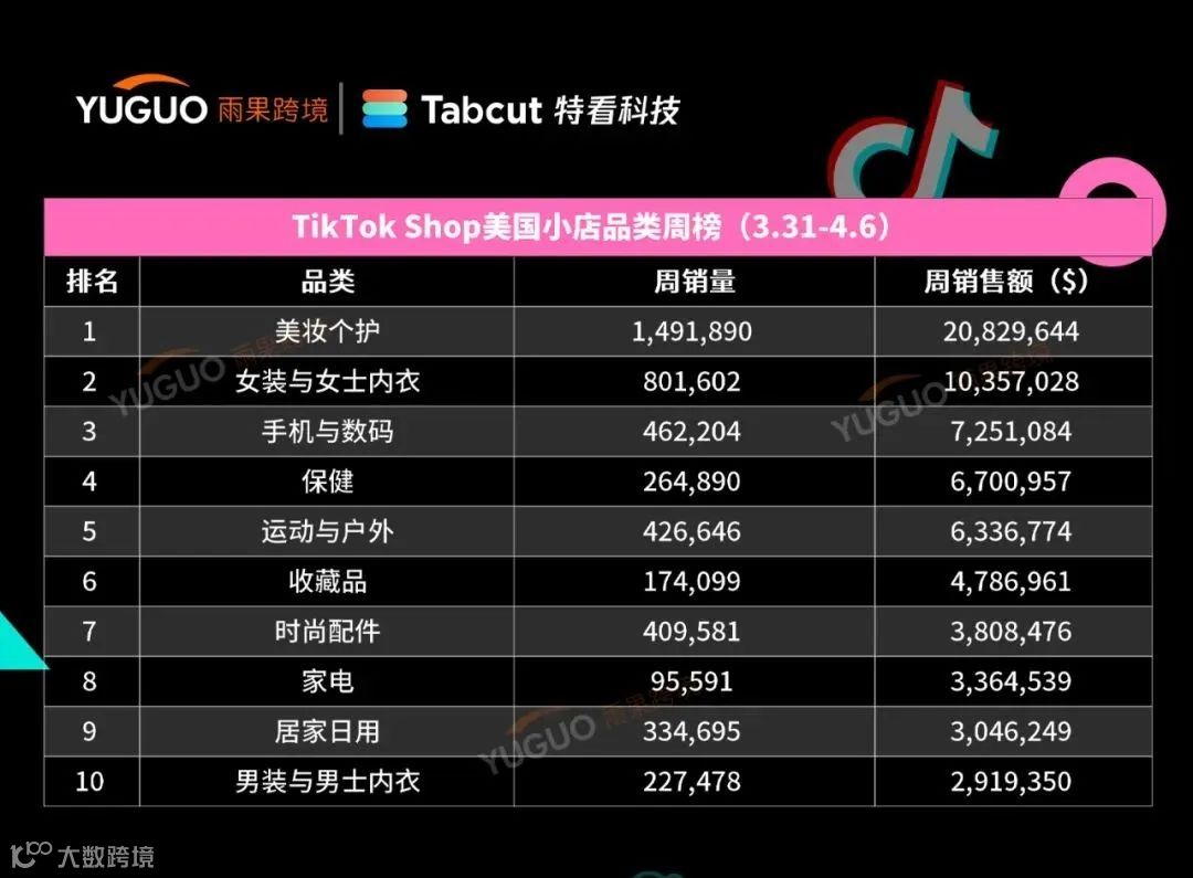 细分品类上,"美妆个护"品类GMV以1472万美元继续领跑;“女装与女式内衣”品类位居第二位,品类GMV达912万美元;“手机数码”品类则已连续两周领先“运动户外”类目排在榜三,品类GMV达725万美元。