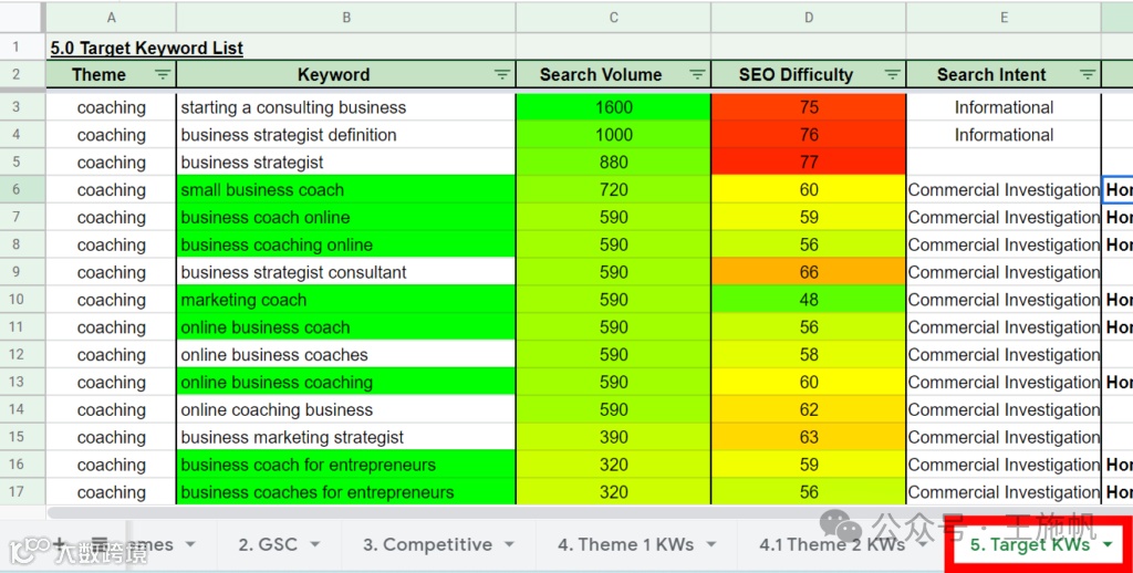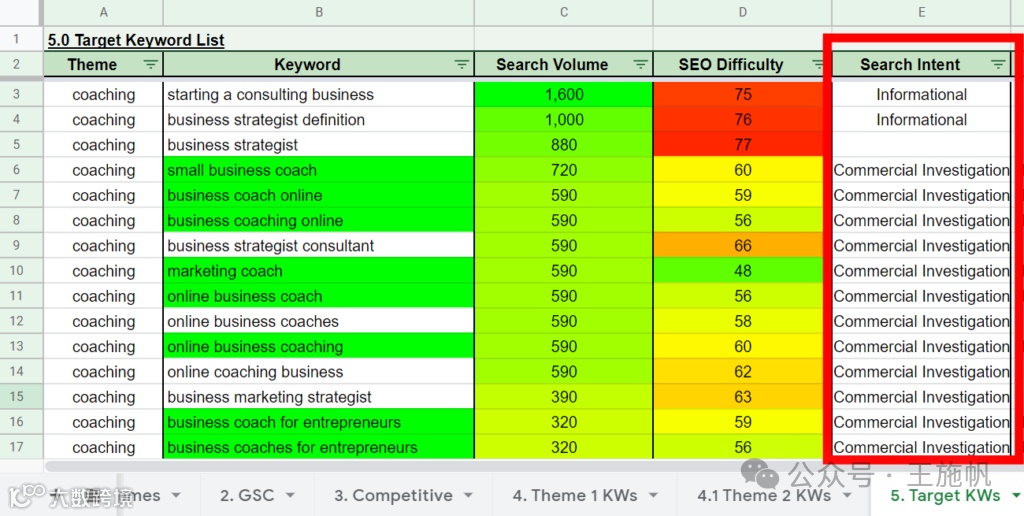 如果您使用的是王施帆的关键字研究模板,难度列将以颜色编码。您应该优先考虑以绿色突出显示的难度较低的关键字。