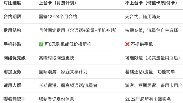 无需签约,可在便利店即买即用,适合游客或短期停留者。资费灵活、价格较低,但无手机补贴,高峰时段网速可能受限,且存在信号覆盖不稳定、售后服务弱、号码曾被循环使用导致无法注册APP等风险。