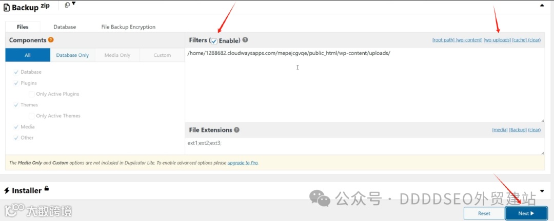 因为WordPress 站点中的 wp-content/uploads 目录可能包含大量图片、视频等媒体文件,缓存文件、临时文件(如 cache 目录),体积庞大,不适合频繁备份。启用Filters (Enable) 选项是排除不必要的文件和文件夹,使备份文件更小、更高效,下载和存储更快,并减少服务器资源占用。可以只备份数据库、插件、主题和必要的配置文件,确保核心数据完整,降低服务器负担,不浪费存储空间。