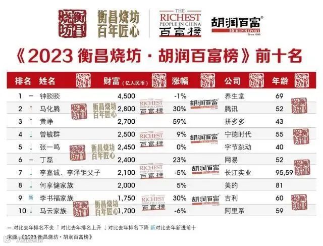 【2023胡润百富榜发布,马化腾重回第二】10月24日,《2023衡昌烧坊·胡润百富榜》发布了最新2023胡润百富榜,榜单显示,钟睒睒为中国首富,马化腾第二位,王健林家族则财富下降最多。