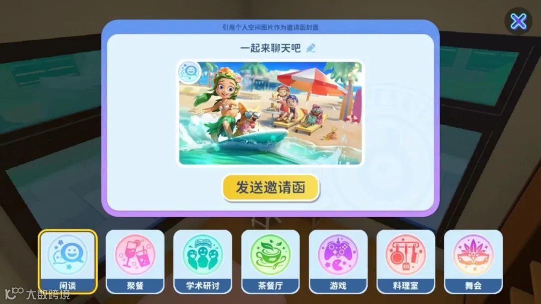 同在养成模块下的家园和装扮两个系统也是《Livetopia: Party!》的重中之重,家园系统承担着《Livetopia: Party!》几乎半数的互动职责,在家园中玩家可以随意装扮家园,将之打造成聚餐、闲聊、学术研讨等近7种不同主题的“乐园”,然后最多邀请30名玩家来参观。