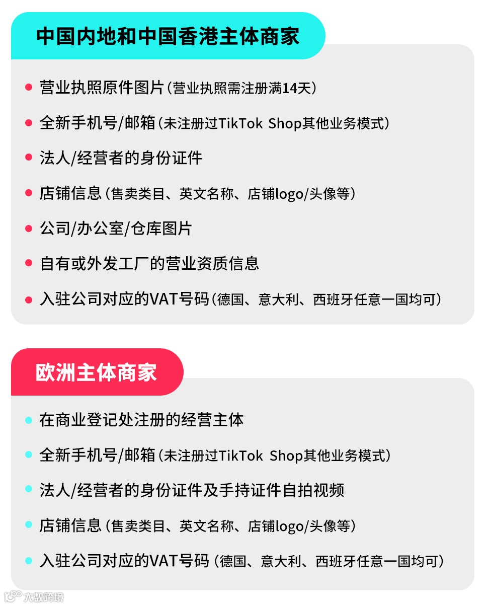 目前TikTok Shop本地托管模式采用定邀入驻机制,主要面向:中国内地主体和中国香港主体卖家,以及欧洲主体(德国、法国、意大利、西班牙)卖家。且同时需满足以下两个核心条件: