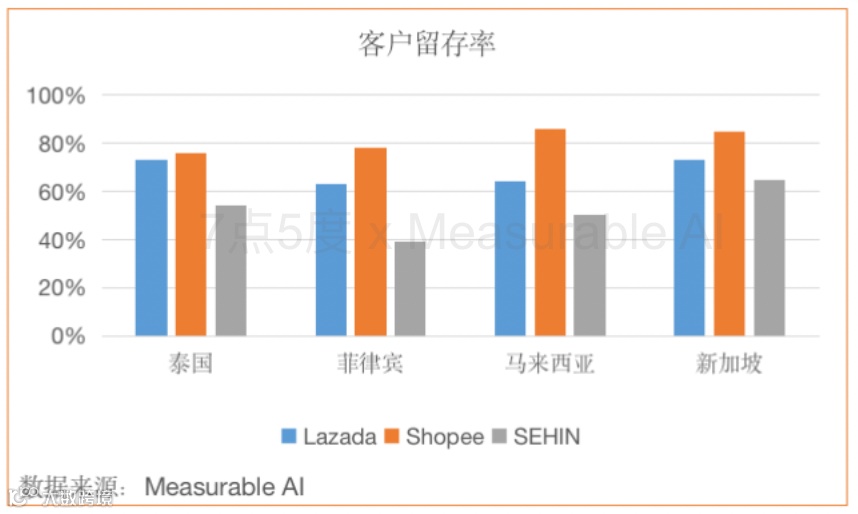 另外一个突出对比是,Shopee和Lazada的用户留存率远远甩开了Shein。Measurable AI的数据显示,东南亚这两大电商平台的客户留存率在泰国、菲律宾、马来西亚和新加坡的客户留存率均在60%以上,甚至高达86%,而Shein的用户留存表现相差较远,在50%左右徘徊。