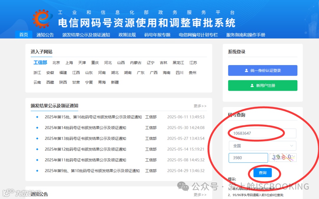 利用工业和信息化部政务服务平台查询短信号码所属企业: