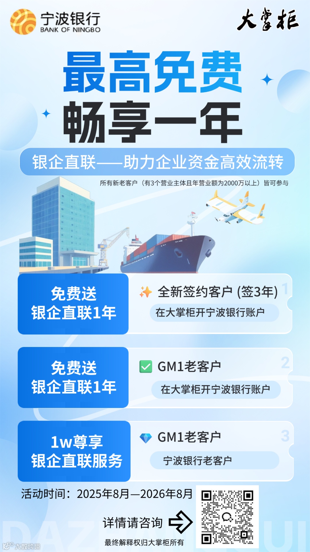 大掌柜数字科技大掌柜与宁波银行携手推出银企直联专属优惠活动!符合条件的企业客户可享受多项权益。
