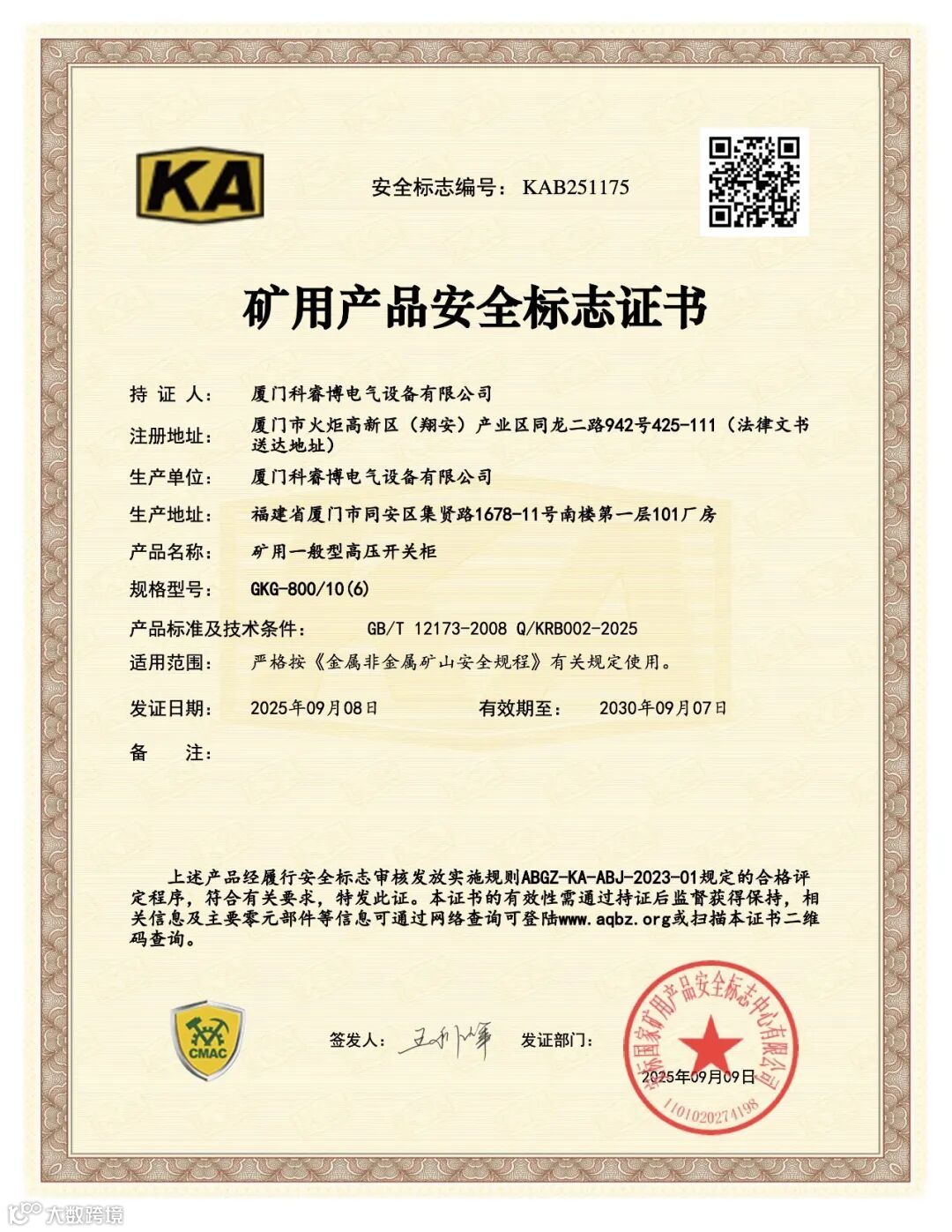 近日,厦门科睿博电气设备有限公司自主研发的SIDW-S可抽出式固体绝缘金属封闭开关设备,通过安标国家矿用产品安全标志中心的严格认证,符合矿用一般型高压开关柜技术标准,正式获得矿用产品安全标志证书(KA证书)。该认证表明产品在安全性、可靠性与适用性方面均达到国家矿用设备相关标准。