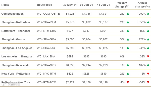 上海至热那亚、鹿特丹至上海运价分别上涨3%至6862美元和661美元/40尺柜;上海至鹿特丹、纽约至鹿特丹上涨2%至6177美元和640美元/FEU;上海至洛杉矶、纽约分别上涨1%至6025美元和7299美元/40尺柜。鹿特丹至纽约下跌1%(18美元)至2118美元/FEU。洛杉矶至上海运价保持稳定。德鲁里预计下周中国出发航线运价将继续上涨,主因亚洲港口拥堵。