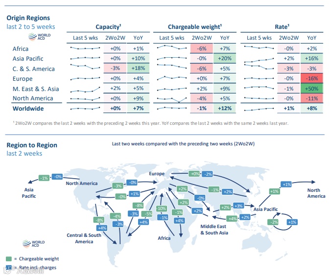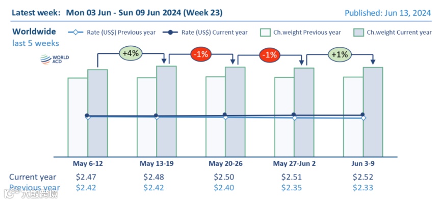 第22-23周全球计费重量环比微降1%,但同比上升12%。