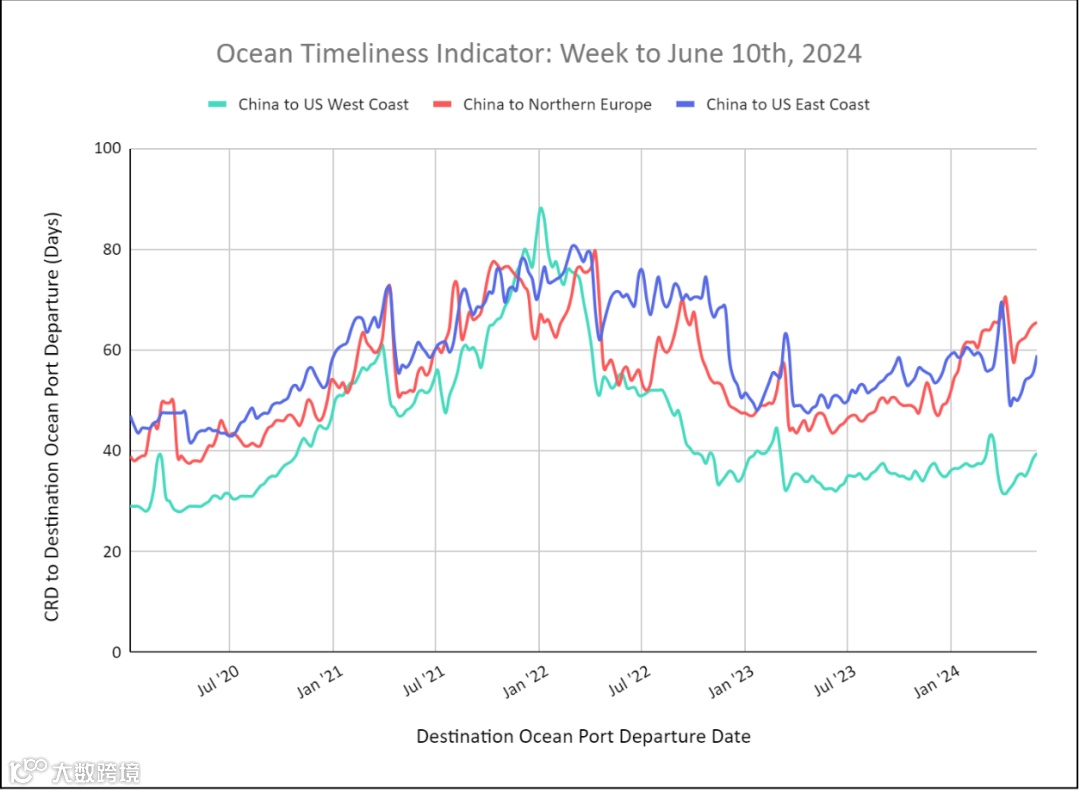 本周,Flexport主要贸易航线准班率指标连续第四周上升。中国至美国东海岸OTI升至59天,中国至北欧OTI因绕行好望角升至66天,中国至美国西海岸OTI升至39天。