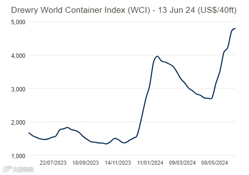 当前WCI指数较2019年疫情前平均水平(1420美元)高出238%。