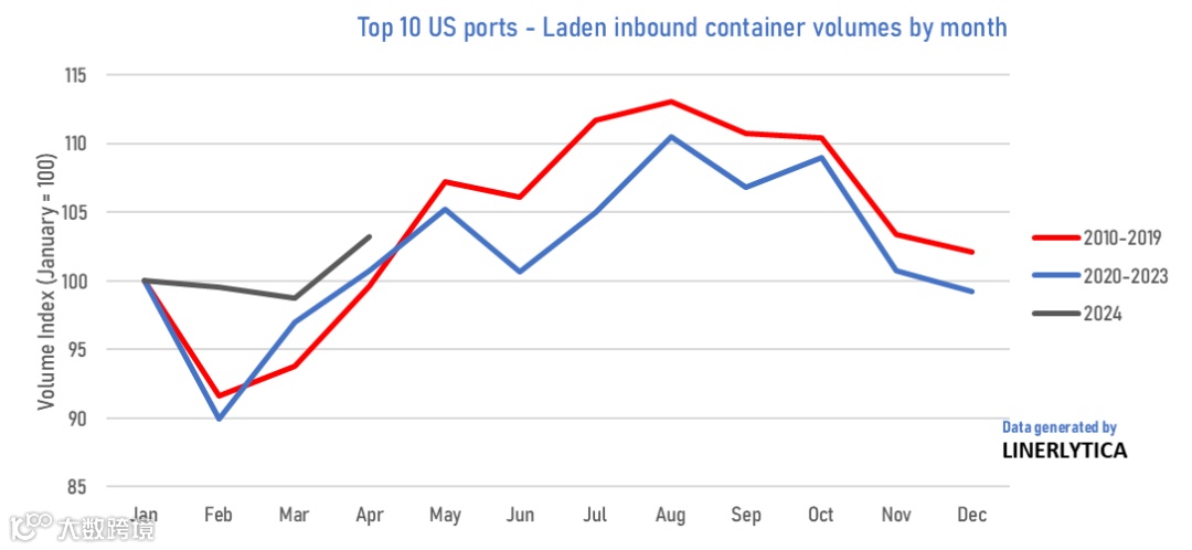 2024年至今平均指数为3443美元/40尺柜,高于十年均值2736美元(该数值受2020-2022年异常高价影响)。