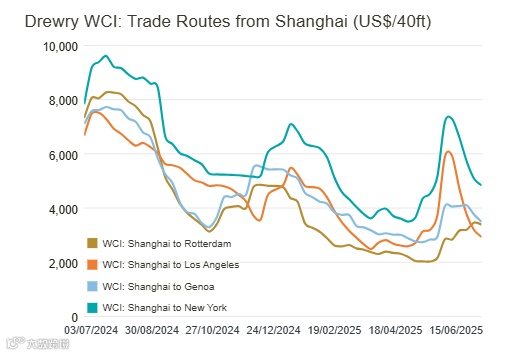 - 上海至洛杉矶即期运价周跌8%至2,931美元/40ft,但较九周前仍高出8%;上海至纽约运价周降5%至4,839美元/40ft,同比上涨33%。Drewry预计下周运价将继续下行,受产能过剩和需求疲弱拖累。