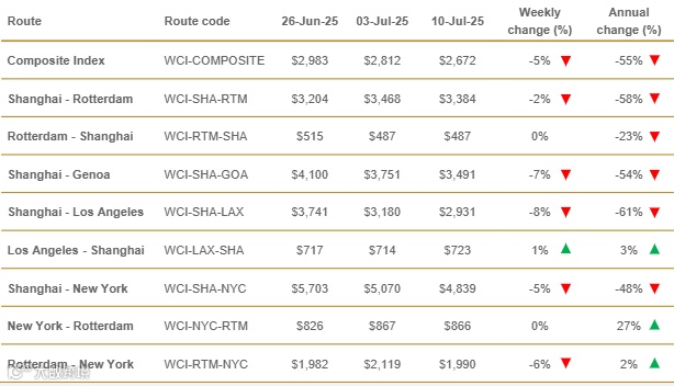 - WCI连续第四周下跌,主因美国方向 cargo 需求疲软,表明此前因关税暂缓引发的进口激增不具备持续性。