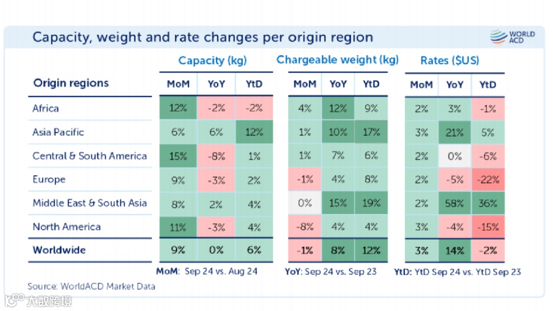 2024年航空货运市场呈现区域分化:欧美出货量增长放缓,亚洲与中东则保持强劲增长。北美始发货物计费重量同比上升4%,但平均运价同比下降15%,导致截至9月的全年航空运费整体下降12%。欧洲虽计费重量增长8%,但同期平均运费下降22%。