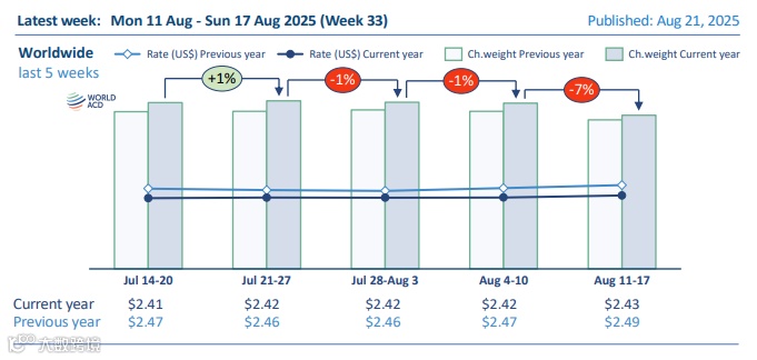 根据WorldACD市场数据,日本及多个欧洲国家的公共假期导致8月中旬空运货量显著下降,与去年同期趋势相似。