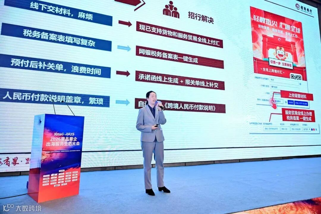 招商银行成都分行交易银行部总经理助理徐建莉介绍“出海无忧,跨境有招”金融服务体系,涵盖跨境结算、汇率避险、融资支持等,通过定制化方案助力企业稳健拓展国际市场。