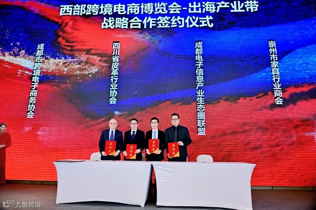 在全体嘉宾见证下,“西部跨境电商博览会——出海产业带战略合作签约仪式”顺利举行。四川省皮革行业协会、成都电子信息产业生态圈联盟、崇州市家具行业商会代表完成签约。作为西部唯一跨境电商专业展会,此次合作标志着跨境电商生态与特色产业带实现深度绑定,推动区域产业协同出海迈入新阶段。