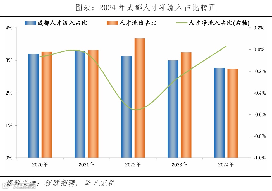 成都:2024年人才净流入占比转正至0.03%。受益于成渝双城经济圈建设,重庆为最大人才来源地(9.2%)。推行“先落户后就业”“蓉漂驿站”等政策,连续六年获评“中国最佳引才城市”。