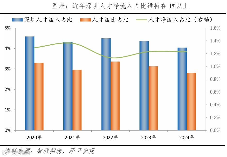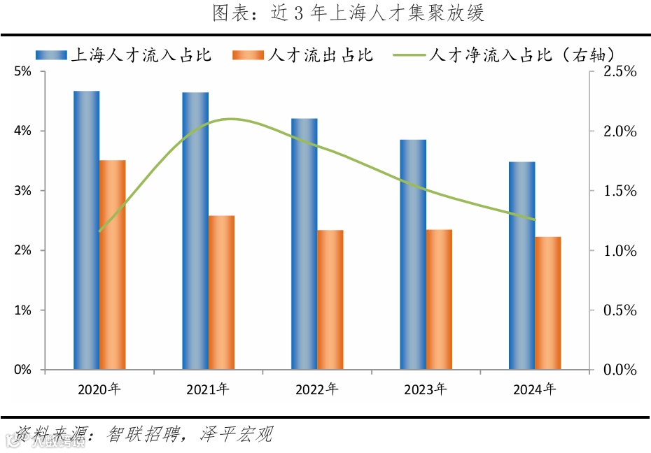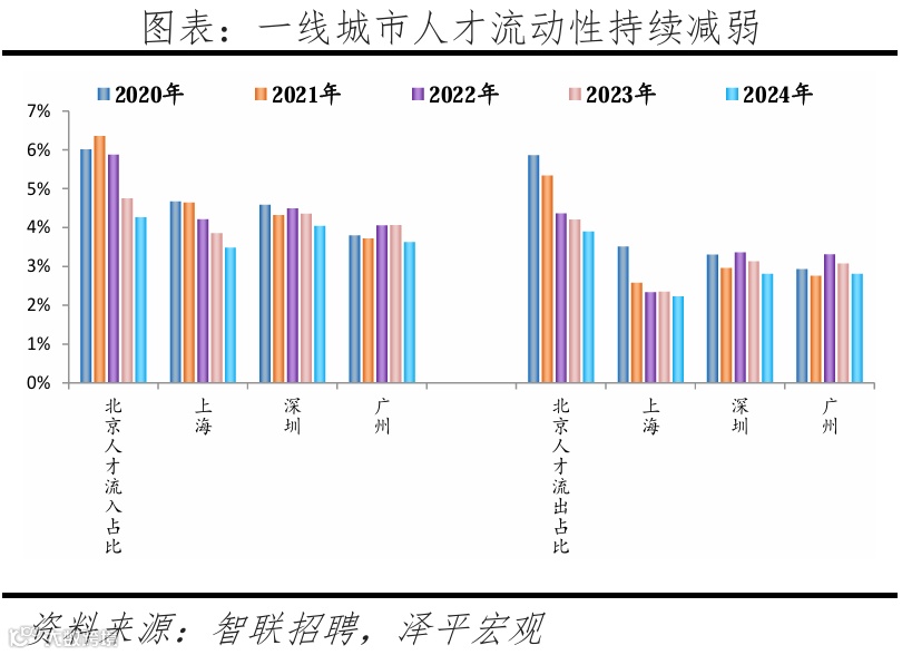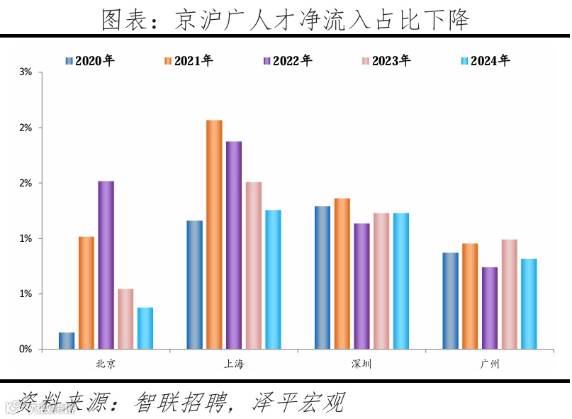 2024年北京、上海、广州人才净流入占比分别为0.4%、1.3%、0.8%,同比均有所下降;深圳为1.2%,保持稳定。上海仍是四大一线城市中吸引力最强的城市。