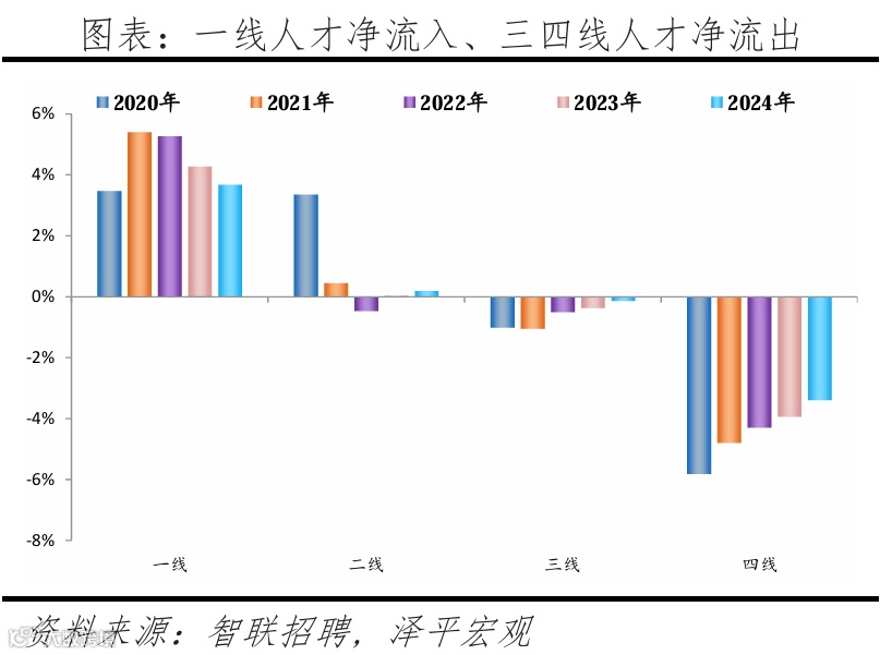 2024年一线城市人才净流入占比为3.7%,较2021年5.4%持续回落,人才集聚速度放缓。二线城市净流入占比为0.2%,连续两年为正,显示人才回流趋势。三线、四线城市净流入占比分别为-0.1%、-3.4%,持续净流出,但流出幅度收窄。