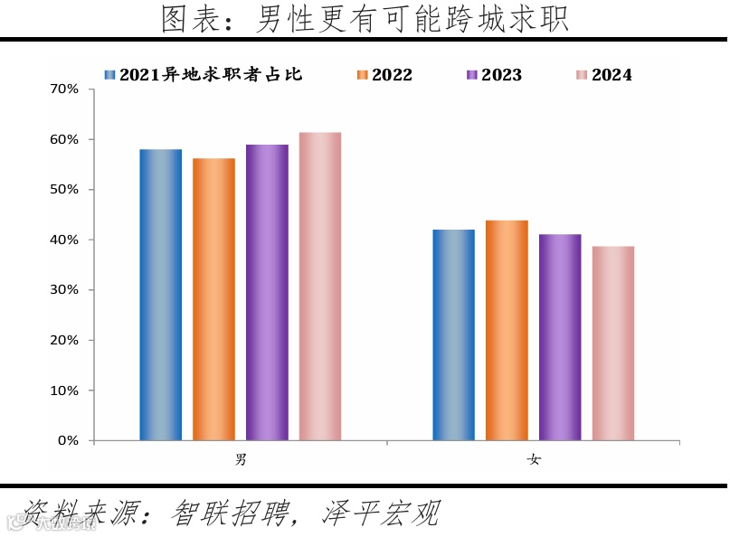 性别结构:2024年流动人才中男性占比61%,高于求职总体的56%。近年来男性更倾向于跨城求职,2024年流动人才男女比例为61:39,较2021年的58:42持续扩大。