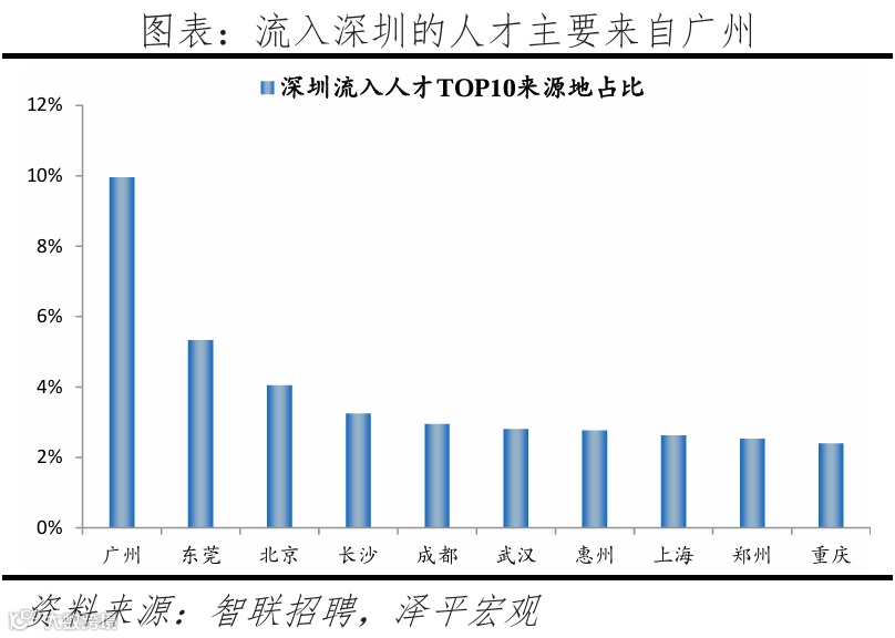 深圳:2024年常住人口增20万,人才净流入占比稳定在1.2%。经济增速快、落户门槛低、创新产业密集支撑人才吸引力。GDP达3.7万亿元,国家高新技术企业超2.5万家,密度全国第一。人才来源集中度下降,前十大来源城市占比38.6%;去向以广州(11.5%)、东莞、惠州为主,珠三角城市占33.5%。
