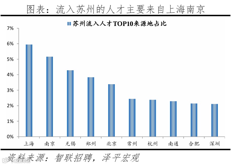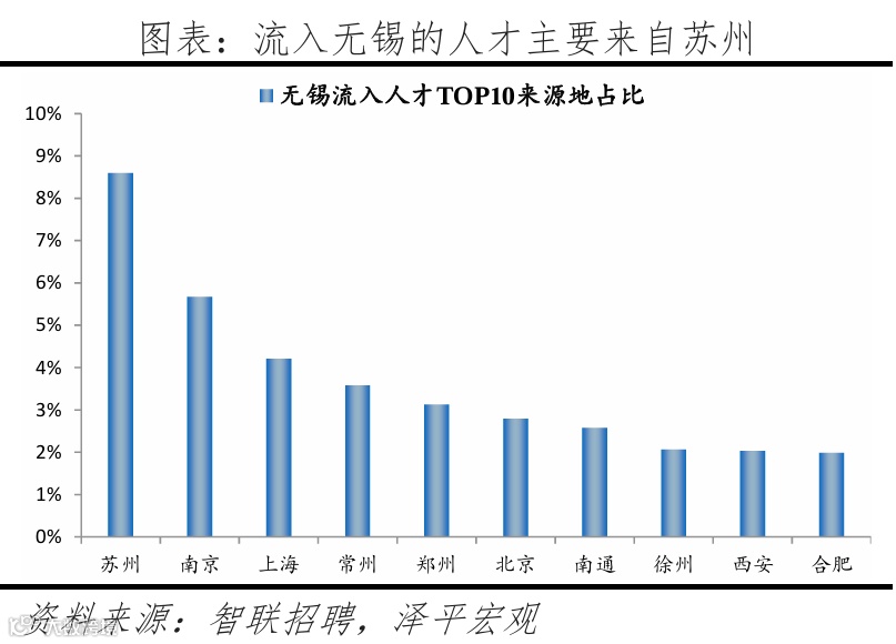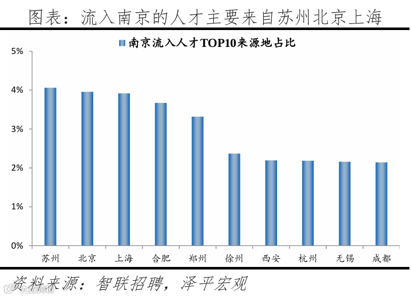 南京:人才净流入占比稳定在0.7%-1%之间。实施“宁聚计划”“人才强市25条”,高新技术产业产值占规上工业比重达50.7%。人才来源与去向高度集中于长三角,去向前十大城市中8个位于长三角,占比36.2%。