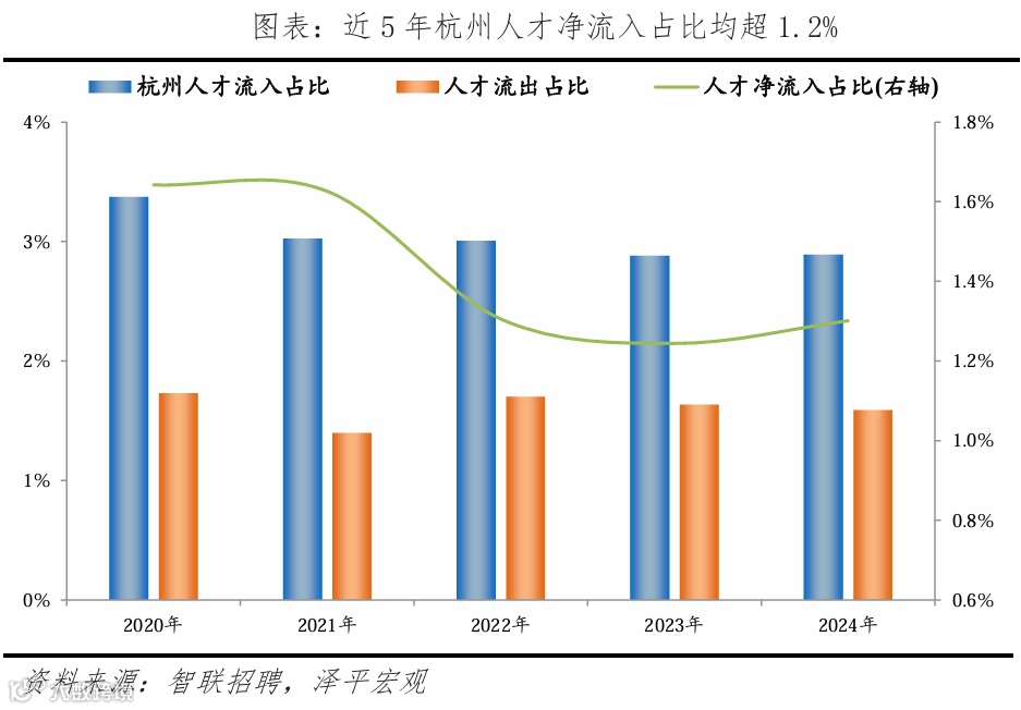 杭州:近五年人才净流入占比始终高于1.2%。数字经济核心产业增加值占GDP比重达28.8%,智能物联、生物医药等产业快速发展。2024年常住人口增10.2万。人才主要来自上海,去向集中于长三角城市,前十大去向中7个位于长三角,占比30%。