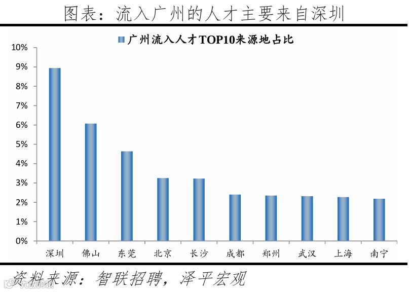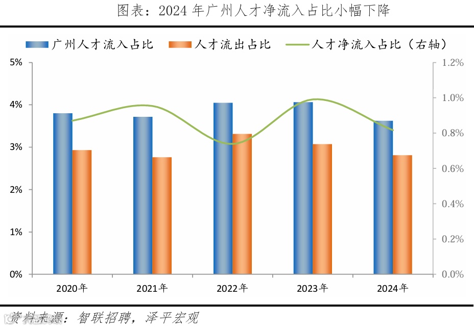 广州:2024年人才净流入占比0.8%,同比下降0.2个百分点。生活成本与房价在一线城市中最低,房价收入比仅17.2。人才来源集中度下降,去向集中度上升,前十大去向城市占比51.9%,其中珠三角占41.6%,城市群内循环特征最显著。