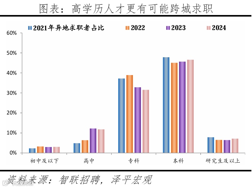 学历水平:2024年流动人才中本科及以上学历占比53.7%,同比提升1.6个百分点,高于求职总体的47%。高学历人才更倾向跨城发展。2021至2023年该比例分别为55.7%、51.6%、52.1%,2024年回升至近年高位。
