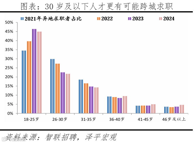 年龄结构:2024年流动人才中18-30岁占比达67%,高于求职总体的61%。其中18-25岁占44.9%,26-30岁占21.7%,表明青年群体是跨城求职主力。2021至2024年,30岁以下流动人才占比分别为64.4%、66.9%、68.9%、66.6%,整体呈上升趋势后小幅回落。