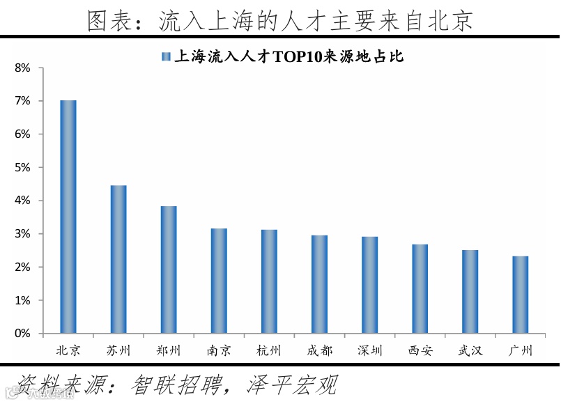 北京:2024年人才净流入占比0.4%,较2023年下降0.17个百分点。近年人口调控与非首都功能疏解导致流入减少。人才主要来自天津(7%),流向以天津(7.9%)、上海为主。北京对津冀辐射增强,流出人才中17%前往京津冀城市,高于上年15.9%。
