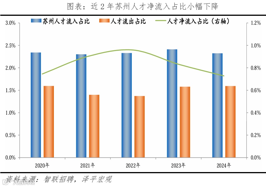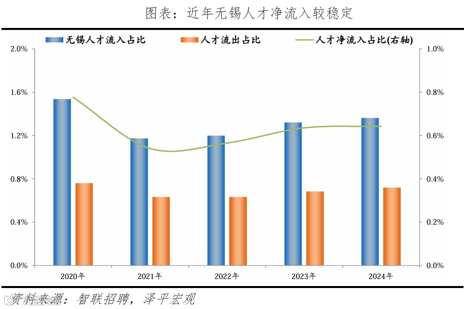 无锡:2024年人才净流入占比0.64%,保持稳定。物联网、集成电路等产业集群规模超2000亿元,入选国家先进制造业集群5个。实施“太湖人才计划”“以赛引才”等举措,连续六年获“中国年度最佳引才城市”,2024年引进大学生10.2万人、高层次人才1.1万人。