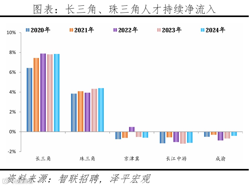 2024年约六成流动人才流向五大城市群。长三角人才净流入占比达7.8%,居各城市群首位,较2020年提升1.4个百分点,持续强吸引力。珠三角从3.8%升至4.4%,保持集聚态势。京津冀连续两年净流出,2024年为-0.6%。长江中游与成渝城市群净流入占比分别为-1.1%、-0.4%,持续外流。