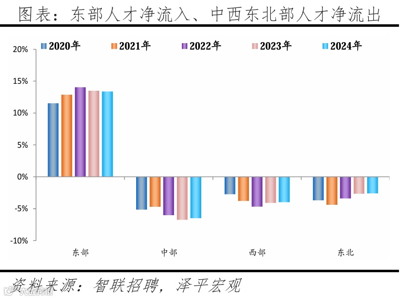 2024年东部地区人才净流入占比为13.4%,虽较前期小幅下降,但仍远高于其他区域,持续吸引人才集聚。中部、西部、东北分别为-6.5%、-4.0%、-2.6%,持续净流出,但西部与东北净流入占比同比均回升0.1个百分点,呈现回暖迹象。