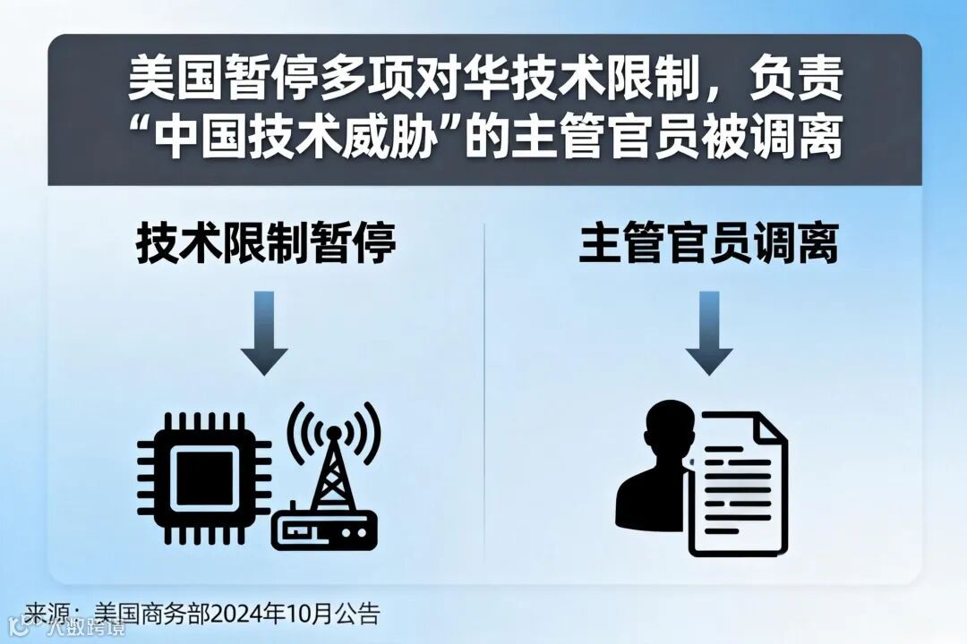 特朗普政府近期暂停多项针对中国技术产品的限制措施,并将负责所谓“中国技术威胁”的美国商务部高级官员调离岗位,显示出美国对华技术管制政策的明显调整。