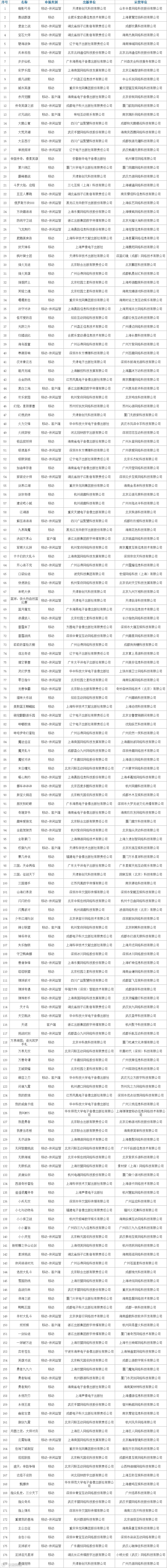 177款国产网络游戏完整版号名单如下: