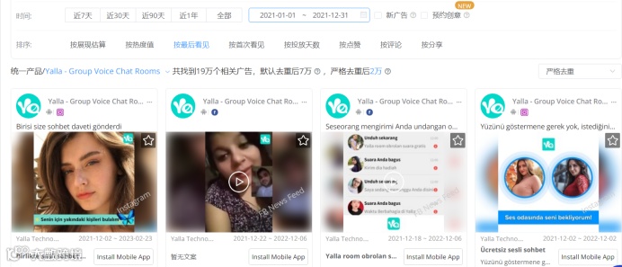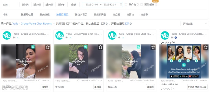 仅以Yalla集团的拳头产品——Yalla-Group Voice Chat的广告投入进行对比。广大大提供数据显示,2021年,Yalla共投放广告素材19万条,而2022年投放总量为34万条。相比新品的前期启动,成熟产品寻找新用户需要花费更高的资金成本。