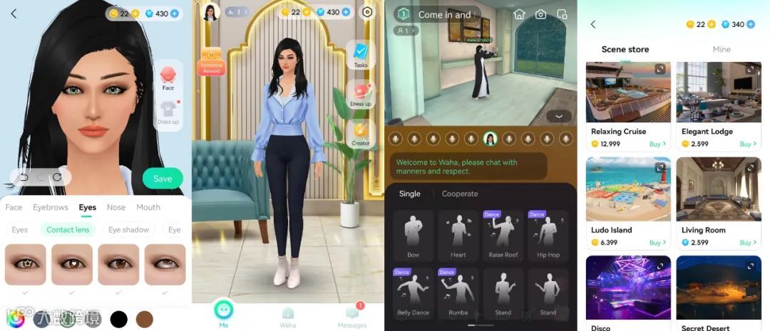 从Avatar来看,人物和场景的画面质量较前期版本更加清晰,Waha目前支持捏脸、服装设计,给予玩家更高的自由度。当玩家换装完毕,系统自动邀请打扮后的玩家去房间转一转,帮助提升用户活跃度。