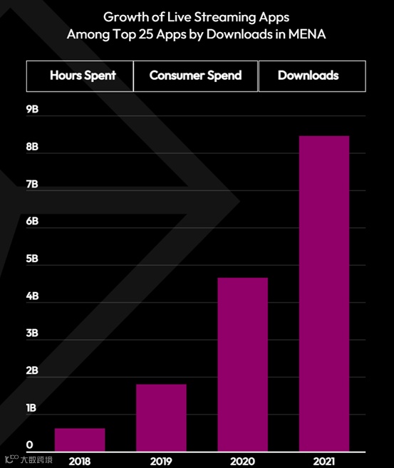 如果说哪个品类表现最佳,以往我们的印象都会认为社交类产品表现最佳,不过实际上,直播行业当之无愧。以使用时长对比来看,在4年的时间内,MENA地区排名前25位的直播应用花费市场的时间比社交市场整体增长12.5倍——同比增长81%,但所有社交应用的增长率仅为5%。