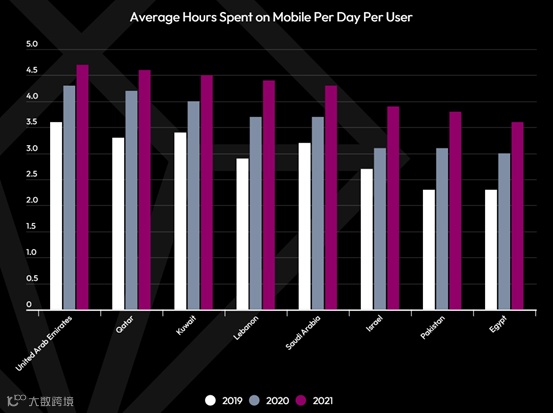 MENA地区的众多国家中,阿联酋用户每天花在手机上的时间最多,为4.7小时。对比来看,平均使用时长增长最快的地区是巴基斯坦(+64%)、埃及(+57%)和黎巴嫩(+49%)。值得一提的是,埃及尤为突出,当地2021年全年下载量为26.57亿次,年增长率为15%,位列全球第十一名。